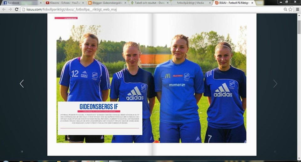 För ett par veckor sen så kom det nya numret av "Fotboll på riktigt" ut som vi nu kan döpa om till "Fotboll ännu mera på riktigt" då detta nummer innehåller en artikel om Gideonsberg. Tidningen har startat en tävling där olika klubbar ska tävla i teknik, precision, snabbhet och känsla och de som fick representera de ljusblå färgerna är Elvira Gustafsson, Moa Godesparr, Sandra Lindström, Josefin Höglander och Amilia Högbacka. Hämta ut nu en tidning på Chicco, Nancys, Coffehouse by George, Global eller någon av de andra ställen man kan hämta om den eller så går det att läsa on-line på deras hemsida och länken dit får du här: http://www.fotbollpariktigt.se/