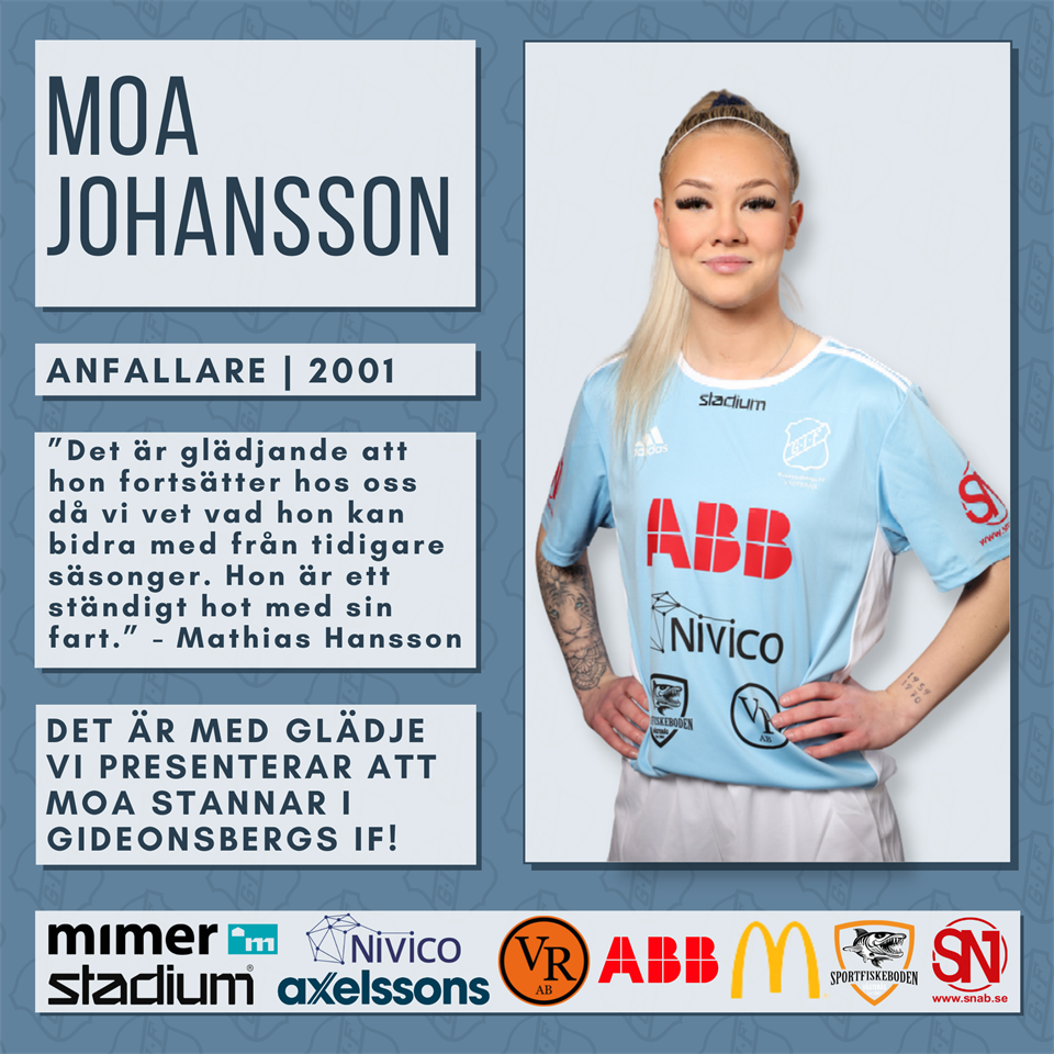 Det är alltid spännande med nyförvärv men minst lika kul är det att få veta att en tongivande spelare väljer att stanna i föreningen. När vi vann division 2 säsongen 2021 var Moa överlägsen skyttedrottning med sina 33 mål och gjorde 10 mål på 17 matcher i div 1 förra året. Ett stabilt facit för den blixtsnabba anfallaren född 2001 - Det är en spelare vars spetsegenskaper verkligen sticker ut. Det är glädjande att hon fortsätter hos oss då vi vet vad hon kan bidra med från tidigare säsonger. Hon är ett ständigt hot med sin fart, säger Mathias Hansson. Vi ser fram att se Moa på plan i ljusblått kommande säsong och önskar henne och laget all lycka nu när försäsongen snart kickar igång! Division 2 Dam 3 jan 2023 0kommentarer