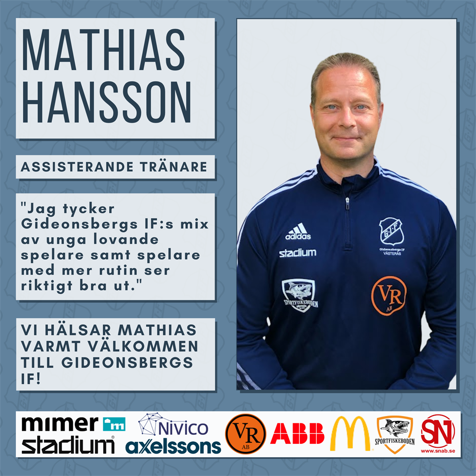 Våra damer är igång i träning efter sommaruppehållet och vi kan idag presentera att ledarteamet förstärkts av Mathias Hansson som ansluter i en assisterande roll. Mathias har goda erfarenheter från ungdomsfotbollen och vi är övertygade om att han med sina egenskaper kommer att bidra till att stärka arbetet i vår damsektion! - Vem är Mathias för dem som inte känner dig? Jag är 47 år gammal, bor i Tortuna med sambo och två barn. Har varit tränare i snart 10 år, initialt i Irsta IF men de senaste åren som huvudansvarig i de äldsta lagen på ungdomssidan i BK30. Har tränat allt från 07:or till 03:or. - Varför kände du att du ville ansluta till laget? Jag tycker Gideonsbergs IF:s mix av unga lovande spelare samt spelare med mer rutin ser riktigt bra ut. Jag vet att truppen stundtals varit skadedrabbad men ändå gjort väldigt bra ifrån sig som nykomlingar i Div.1. GIF kunde även erbjuda en lösning som passar mig med jobb och övriga livet. - Hur är känslan inför hösten? Känslan är bra, jag hoppas att kunna bidra med dels taktik samt givande träningar för att truppen skall var så förberedd som möjligt inför att serien skall avslutas, och förhoppningsvis kan vi ta någon av plasterna i tabellen som garanterar en plats i div.1 även nästa säsong. Vi hälsar Mathias varmt välkommen till Gideonsbergs IF och önskar honom och teamet all lycka med arbetet framöver!