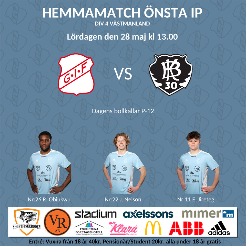 Kommer med all sannolikhet bli en riktigt tight och tuff match. Därför känns det extra skönt att vi har tagit in två benhårda interimcoacher i form av Oskar Andersson och Elliott Jireteg till denna matchen. BK30 har spelat ihop 6 poäng på det första 5 omgångarna medans vi ligger på 9. Vi inledde starkt med två vinster följt av två, klart sämre insatser. Vi hittade tillbaka mot Irsta och ska nu fortsätta på den inslagna vägen. Klassisk 6 poängs match, nu gäller det att vi tar chansen att rycka ifrån en seriekonkurrent i toppen! Sist lagen möttes blev det 3-2 till BK30. //Albin Ramström Randy Obiukwu 1. Vem skulle du kalla svärmorsdrömmen i laget? = Ibbe 2. Favoritklubb förutom GIF = Manchester United 3. Vem är mest fåfäng i laget? = Carl 4. Beskriv John Nelson med tre ord = Konsekvent, ingen rädsla, lugn John Nelson 1. Vem skulle du kalla svärmorsdrömmen i laget? = Felix 2. Favoritklubb förutom GIF. = Newcastle United 3. Vem är mest fåfäng i laget? = Calle 4. Beskriv Elliott med tre ord. = Energisk, temperamentsfull, vinnarskalle. Elliott Jireteg 1. Vem skulle du kalla svärmorsdrömmen i laget? = Marcus 2. Favoritklubb förutom GIF. = Tottenham 3. Vem är mest fåfäng i laget? = Mig själv 4. Beskriv Randy med tre ord. = Stark, målfarlig, schysst //GIF Herr önskar alla välkomna.