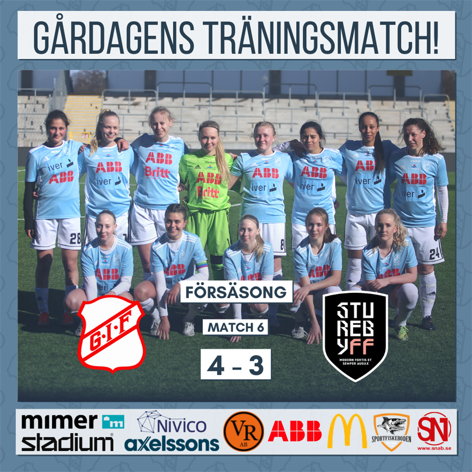Gårdagens match mot Stureby FF var en händelserik match med många mål och en stark upphämtning efter en tuff start. Efter 27 spelade minuter låg GIF under med två mål. - Jag tycker inte vi var vakna från början och får i och med det 2 mål i baken. Tycker det var svårspelat i stormen, vi hade motvind i första halvlek. I andra halvlek taggar vi om och fick tillbaka lite av vårt normala spel vilket resulterade att vi vände matchen med 4 mål i andra halvlek. Kul med flera olika målskyttar och att vi ännu en gång visar att vi kan vända ett underläge och vinna, säger kapten Nikita Stigsson efter matchen. För en vinst blev det till slut. I halvtid kommer laget ut på plan med lite justeringar, positionsbyten och en fin inställning som ger utdelning direkt när Maria Bar-Sawme reducerar tidigt i halvleken. Sedan kommer Sofia Hasler, som inledde matchen i försvaret, in på en ovan position som central anfallare och kvitterar samt är inblandad i de andra två målen. - Jag blev förvånad när jag fick veta att jag skulle kliva in som anfallare eftersom att jag brukar spela i försvaret. Jag fick en tydlig uppgift att störa deras uppspel genom att pressa deras mittback som de ville bygga spelet ifrån. - Jag kände att det gick bra för mig där men framför allt så är det laget som rycker upp sig. Vi var inte alls med i första halvlek och när vi kommer in i andra så visar vi en helt annan inställning och får till ett bättre spel, säger Sofia. Det är onekligen starkt att göra fem mål på en halvlek (Nikita fick dock sitt felaktigt bortdömt för offisde) och det är kul att se att våra spelare kan hantera lite motgångar på rätt sätt! - Eftersom att det var en träningsmatch där vi provade lite nya saker var resultatet mindre viktigt. Men den mentalitet de visar genom att vända matchen i andra halvlek är oerhört stark och något vi tränare är oerhört nöjda över att ha fått se, säger Andreas Roos Nu väntar en ny träningsvecka och sista försäsongsmatchen mot IK Tun innan seriepremiären. Vi tackar Stureby för en tuff och väldigt givande match och önskar dem lycka till i sin Division 1 serie. Vi tackar även våra sponsorer och publiken för ert stöd!