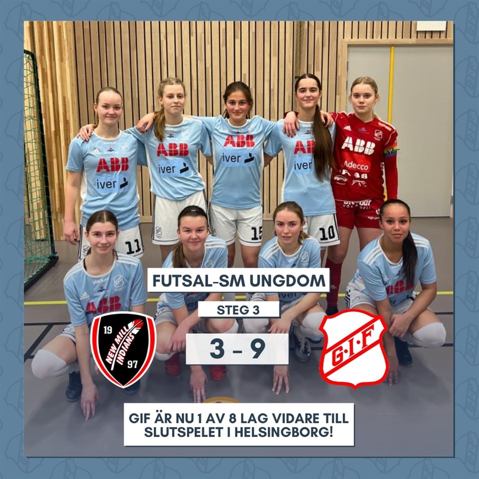 Vi vill med stolthet lyfta upp dagens insats från våra spelare ur både Dam- och F17-truppen som spelade steg 3 i futsal-SM ungdom mot New Mill Indians i Nykvarn. En väl genomförd match där fina kombinationer från våra unga förmågor och bra målvaktsspel GIF till en seger med 9-3. Detta betyder att vi är en av åtta föreningar som tagit oss hela vägen till slutspelet, som i år kommer att spelas i Helsingborg. Bra jobbat tjejer!