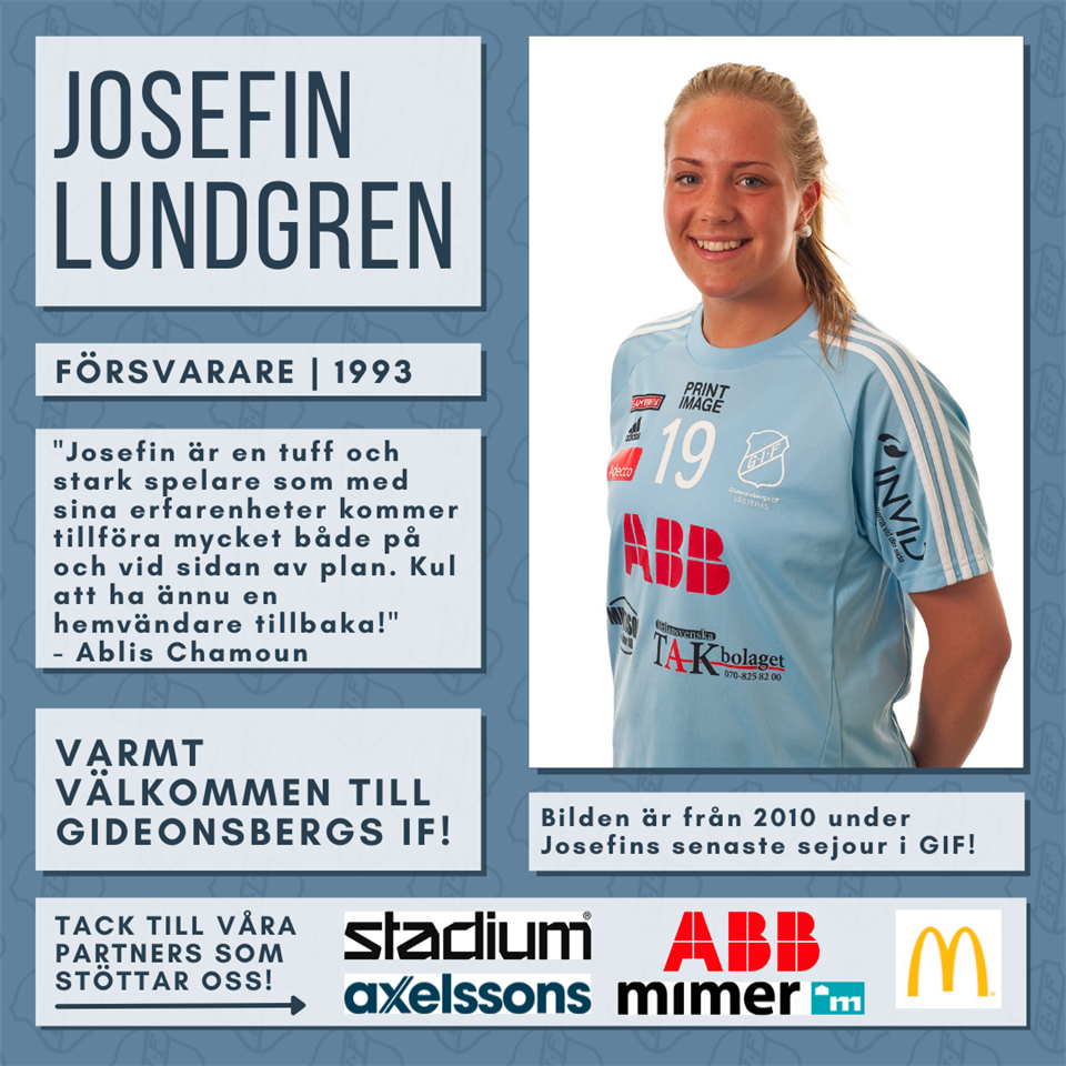 Vi kan med glädje presentara ännu ett nyförvärv nu när det blivit klart att Josefin Lundgren återvänder till laget! Ni kan som alltid läsa spelarens egna tankar om det här nedan: Hur ser du tillbaka på dina tidigare år i GIF? - Jag ser tillbaka på tiden i GIF som positiv, vi hade bra sammanhållning och gemenskap i laget både i flicklaget samt A-laget. Jag har bara roliga och bra minnen ifrån GIF! Kan säga att det var där jag också utvecklades som mest. Jag började när jag var 11 och slutade 2013. Hur har din spelarkarriär varit sedan dess? - Efter GIF spelade jag i Rytterne IF till år 2015. Var med och startade upp HSK en säsong, sedan tog ja uppehåll ifrån fotbollen i 3 år. Jag började sedan spela för Enköpings damlag. Hur skulle du beskriva dig själv som spelare? - Tuff & stark bra spelförståelse och en lagspelare. Vad fick dig att ansluta till GIF inför 2022? - De var nog Erik haha, samt att vi är några gamla spelare från GIF som kommit tillbaka! Det är en talangfull men ung trupp du ansluter till i din återkomst i ljusblått. Vad känner du själv att du kan bidra med på och vid sidan av planen? - Mina erfarenheter som fotbollen har gett mig. Hålla en bra sammanhållning i laget samt en positiv inställning, vara stöttande för dom yngre men också för att finnas där på plan och vid sidan av plan. I ledarrummet gläds man över att ännu en spelare hittat hem till GIF. - Josefin är en tuff och stark spelare som med sina erfarenheter kommer tillföra mycket både på och vid sidan av plan. Kul att ha ännu en hemvändare tillbaka, säger Ablis Chamoun. Vi hälsar Josefin varmt välkommen hem till oss och önskar henne och laget all lycka under kommande säsong!