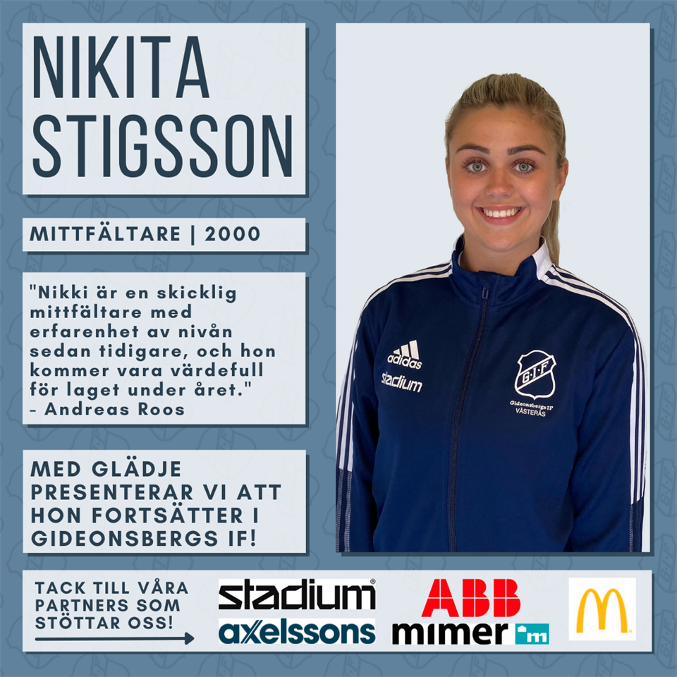Nikita Stigsson var under 2021 en viktig pusselbit på mittfältet som vi kan presentera kommer fortsätta i GIF! "Nikki" började spela fotboll med killar i Munktorp och sedan flick- och damfotboll i Forsby. Hon spelade även i IFK Västerås och Eskilstuna Uniteds F19 innan hon gick till BK30: - I BK30 blev det 4 säsonger, varav en i elitettan. Sen tappade jag motivationen och hade ett uppehåll i ett halvår innan jag anslöt till GIF förra säsongen. Div 2 var en lagom nivå för att få upp glädjen igen och det blev ju lyckat då vi gick upp till div 1 också, säger Nikita Hur ser du på säsongen 2021? - En rolig säsong där jag hittade glädjen i fotbollen igen. Det började lite tungt då jag varit ifrån det ett tag, men var ganska snabbt inne i det igen. Då jag hade spelat i högre divisioner innan kände jag att jag kunde ta lite mer ansvar på planen vilket nog gjorde att jag vågade ta för mig och visa mina styrkor mer. Vad driver dig med fotbollen? Och varför är GIF rätt miljö? - Framför allt gemenskapen man får av att spela i ett lag, men även att jag är en vinnarskalle som alltid ger järnet för att vinna. Här känner jag mig som en viktig spelare i laget. Hur är känslan och förväntningarna inför säsongen? - Jag tror det kan bli ganska tufft med tanke på att det är en väldigt ung trupp vi har. Men utmaningar är alltid roligt och vi har bra kvalitéer i laget så det ska bli kul och spännande att se hur de går. Vad krävs för att prestera lika bra i Div 1? - För att vi ska prestera tror jag det är viktigt att vi spelar tillsammans och inte kör enmansshower. I och med att tempot är högre än i Div 2 så behöver vi förbättra kvalitén på passningsspelet, köra en till två touch och röra oss mycket på planen. I ledarrummet är man nöjda över att ha Nikita kvar i laget. - Nikki är en skicklig mittfältare med erfarenhet av nivån sedan tidigare, och hon kommer vara värdefull för laget under året. Med sin aviga spelstil är hon mycket svår att ta bollen av, säger Andreas Roos Vi riktar ett stort tack till Nikita för hennes insatser under 2021 och önskar henne och laget all lycka under 2022!