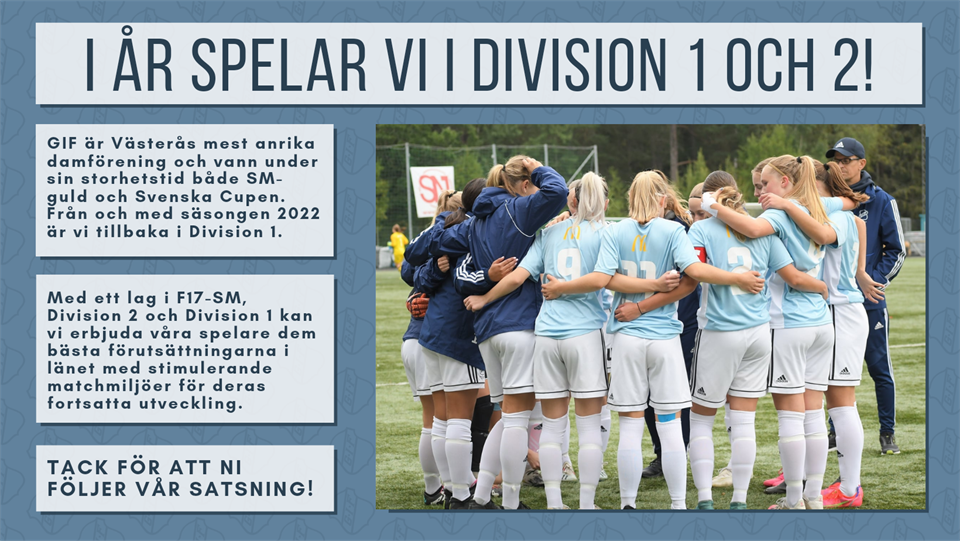 Som förening strävar vi alltid efter att skapa dem bästa möjliga förutsättningarna för att man hos oss ska kunna utvecklas som spelare, människa och som kollektiv. Utöver den framgångsrika talangutvecklingen vi står för i vår ungdomssektion så gick det under förra året att följa ett damlag som mycket övertygande vann division 2 och som i år har som mål att etablera sig i division 1. Idag kan vi med stolthet och glädje presentera en satsning som för oss ytterligare ett steg framåt i vår långsiktiga satsning och vision. Det står nu klart att vi utöver att ha ett lag i division 1 och i F17-SM även kommer att ha ett i division 2, vilket betyder att vi nu kan erbjuda våra spelare de bästa förutsättningarna i länet med stimulerande matchmiljöer för deras fortsatta utveckling. Genom att ha en röd tråd från F17 via GIF 2 Till GIF Dam i Division 1 så kommer vi dels kunna förbereda våra unga talanger ännu bättre för seniorfotbollen, samtidigt som de äldre erbjuds ännu en matchmiljö av kvalitet. Vi vill ha låga trösklar mellan våra lag och nu kommer vi stå varandra närmre än någonsin där både spelare och ledare kommer att kunna arbeta tillsammans för varandras framgångar som ett enda stort ljusblått team! Vi ser nu fram emot ett givande fotbollsår där vi nu kan jobba bättre än någonsin för våra lag och för Västerås damfotboll.