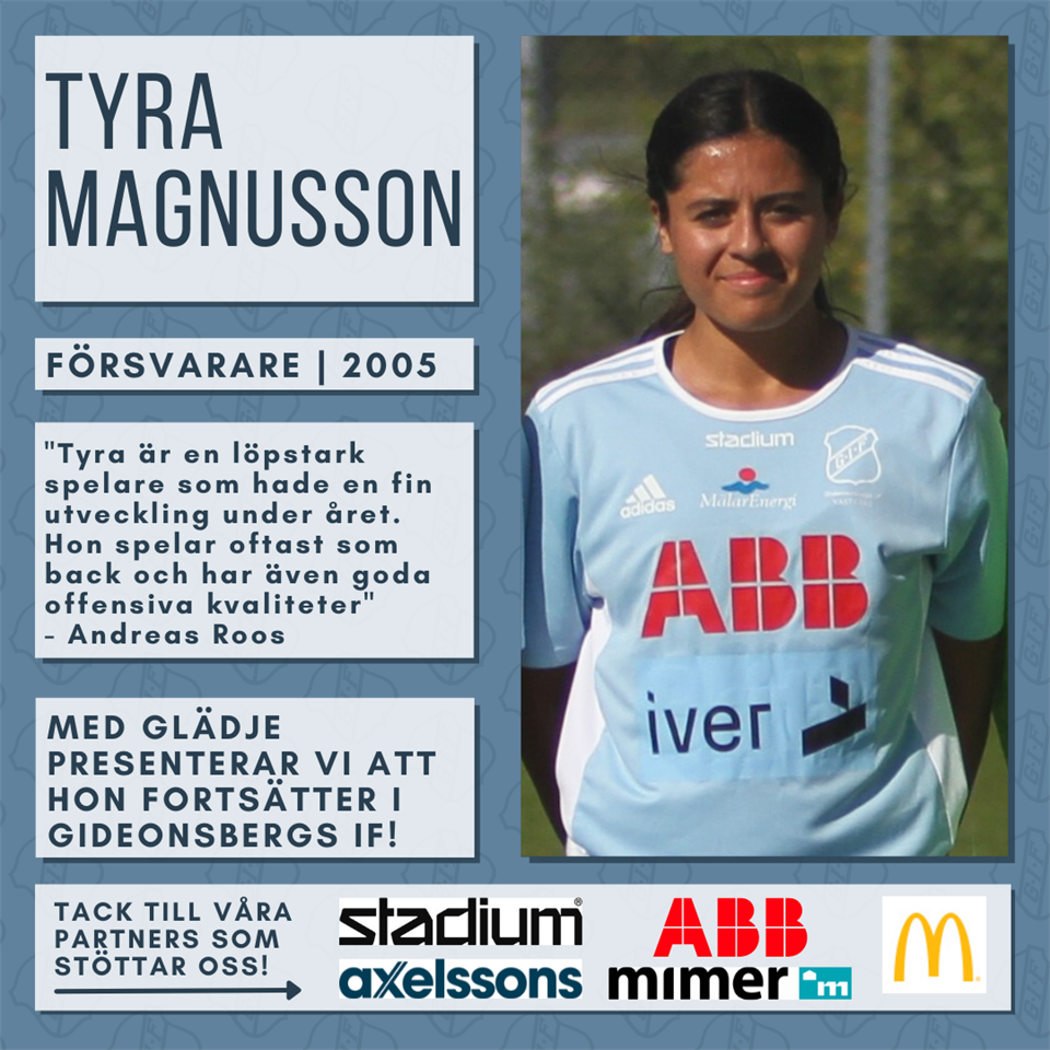 Tyra Magnusson var under förra säsongen med och bidrog till seriesegern i Division 2. Vi kan med glädje presentera att Tyra fortsätter hos oss! Här nedan kan ni läsa mer om Tyra. Hur ser din fotbollsbakgrund ut? - Jag började spela fotboll i IFK när jag var 7 år, sedan slog vi ihop med GIF i början av 2019. Hur ser du på säsongen du haft under 2021? - Jag utvecklades mycket under förra säsongen då det blev mycket träning och matcher. Vi spelade ju både i F17 under våren och början av hösten och även i Divison 2. Jag tycker även att vi som lag har utvecklats mycket då vi har spelat ihop oss bra vilket har lett till mycket mål och vinster vilket har varit jätteroligt. Vad är det som driver dig när det kommer till fotbollen? Och varför är just GIF rätt miljö att fortsätta i? - Det som driver mig är att jag tycker det är roligt att träna och träffa laget. En annan sak som driver mig är självklart att jag vill utvecklats och bli så bra som möjligt vilket jag tycker att tränarna och spelarna i GIF har hjälpt mig med. Hur är känslan och förväntningarna inför säsongen 2022? - Det känns bra och spännande med nya utmaningar. Jag tror att det kommer bli stor omväxling att spela i Divison 1 med tuffare och mer jämna matcher men jag tror att vi kommer kunna mäta oss med det motståndet. Under 2021 var du en del av det lag som så övertygande vann div 2. Vad tror du krävs för att du själv och laget ska fortsätta utvecklas och prestera lika bra även i div 1? - Vi måste fortsätta träna hårt och var och en måste se till att göra sitt bästa för att ge varandra förutsättningarna att utvecklats och bli så bra som möjligt. Huvudtränare Andreas Roos har tränat Tyra sedan hon kom till GIF och har därmed följt hennes framsteg på nära håll. - Tyra är en löpstark spelare som hade en fin utveckling under året. Hon spelar oftast som back och har även goda offensiva kvaliteter. Det är en driven och lojal spelare med fortsatt stor utvecklingspotential säger Andreas om Tyra. Vi tackar Tyra för hennes insatser under 2021 och är oerhört glada över att ha henne kvar hos oss. Vi önskar henne och laget all lycka under 2022!
