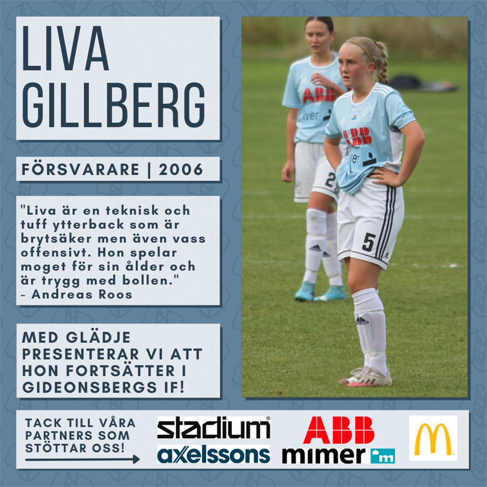 Samtidigt som vi önskar er alla ett gott nytt år så passar vi på att presentera ytterligare en spelare för 2022 års damtrupp! Det är Liva Gillberg som på sin ytterbacksposition var med och spelade upp GIF i Division 1 och togs även ut i F06 landslaget. Vi har ställt några frågor till Liva om hennes tankar om säsongen och framtiden. Hur ser din fotbollsbakgrund ut? - Klubbarna jag har spelat i är IK Oden, GIF och BK30. För 1,5 år sedan anslöt jag till GIF:s F17-lag. Hur ser du på säsongen du haft under 2021? - Säsongen har varit väldigt utvecklande för min del. Från att ha spelat offensivt har jag börjat spela back, både i F17-laget och Damlaget. Vad är det som driver dig när det kommer till fotbollen? Och varför är just GIF rätt miljö att fortsätta i? - Jag älskar fotboll och jag siktar alltid på att bli bättre. Sammanhållningen i laget är bra, vi har väldigt roligt tillsammans och jag känner att jag utvecklas hela tiden. Hur är känslan och förväntningarna inför säsongen 2022? - Känns jättekul. ska bli spännande och se hur vi står oss i Div 1 med tanke på att vi är ett ungt lag. Under 2021 var du en del av det lag som så övertygande vann Div 2. Vad tror du krävs för att du själv och laget ska fortsätta utvecklas och prestera lika bra även i Div 1? - Att vi tränar hårt och att alla gör sitt bästa. Att ha en positiv inställning och bra kommunikation i laget. Från ledarrummet sägs följande om Liva: - Liva är en teknisk och tuff ytterback med vass offensiv. Hon spelar moget för sin ålder och är trygg med bollen. Hon har haft en fin utveckling under året, säger Andreas Roos. Vi tackar Liva för hennes insatser under 2021 och är oerhört glada över att ha henne kvar hos oss. Vi önskar henne och laget all lycka under 2022!