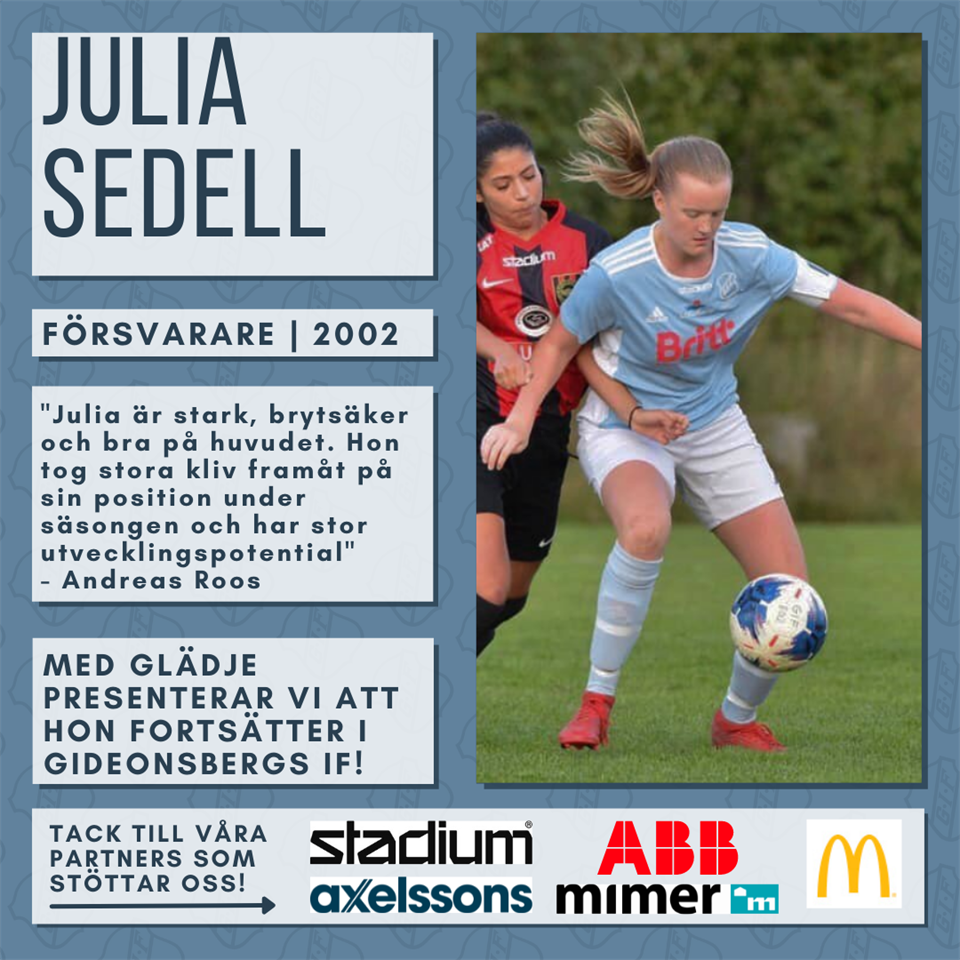 Julia Sedell har spelat i ljusblått länge och fick förra säsongen fira en serieseger. Vi kan med glädje presentera att mittbacken spelar vidare hos oss och har ställt några frågor till henne. Hur ser din fotbollsbakgrund ut? - Jag startade min fotbollskarriär i Tillberga IK och vid ca 11-12 års åldern anslöt jag till GIF. Hur ser du på säsongen du haft under 2021? - Säsongen för mig har känts väldigt bra. Jag startade säsongen på en helt ny position som mittback. Sedan blev det så bra att jag blev kvar på den positionen. Så det var en väldigt lärorik säsong för mig. Vad är det som driver dig när det kommer till fotbollen? Och varför är just GIF rätt miljö att fortsätta i? - Det som driver mig är att alltid kunna prestera så bra jag kan och alltid kunna utvecklas och bli bättre. Och det tycker jag GIF kan erbjuda. Hur är känslan och förväntningarna inför säsongen 2022 - Min känsla kring nästa säsong är att det kommer bli spännande och tufft med nytt motstånd. Men det kommer bli roligt för laget med alla utmaningar. Under 2021 var du en del av det lag som så övertygande vann div 2. Vad tror du krävs för att du själv och laget ska fortsätta utvecklas och prestera lika bra även i div 1? - Inför nästa säsong så krävs det alla att tränar på bra och pushar varandra så att vi kan bli bättre som lag. Och har vi alla viljan att bli bättre som lag så tror jag vi kommer kunna prestera på matcherna. Som alltid har vi hört vad som sägs i ledarrumet om spelaren: - Julia är stark, brytsäker och bra på huvudet. Hon tog stora kliv framåt på sin position under säsongen och har stor utvecklingspotential, säger Andreas Roos Vi tackar Julia för hennes insatser under 2021 och är oerhört glada över att ha henne kvar hos oss. Vi önskar henne och laget all lycka under 2022!