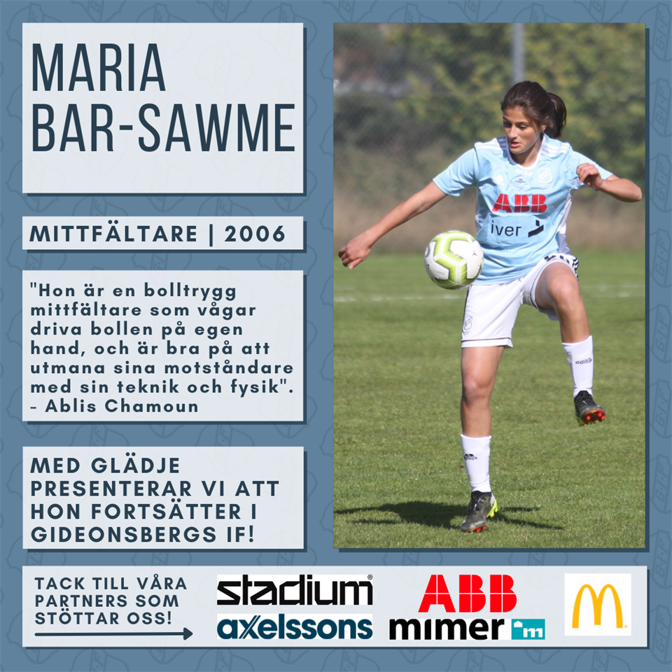 Maria Bar-Sawme återvände till sin moderklubb i år och visade framfötterna efter att ha kämpat sig igenom en lång skadeperiod. Ni ska nu få lära känna henne bättre. Hur ser din fotbollsbakgrund ut? - Jag började i GIF när jag var liten och flyttade till Stockholm där jag sedan spelade i AIK. Nu är vi tillbaka i Västerås och jag har spelat med F-17 majoriteten av säsongen. Hur ser du på säsongen du haft under 2021? - Innan vi flyttade var jag skadad och hade inte spelat någon fotboll på 10 månader. Min säsong har alltså mest handlat om att få så mycket matchtillfällen som möjligt för att kunna få upp min kondition och fysik. Vad är det som driver dig när det kommer till fotbollen? Och varför är just GIF rätt miljö att fortsätta i? - Mitt största driv är min kärlek till fotbollen. Jag älskar att träna och att få träffa mina vänner. Samtidigt älskar jag att spela i GIF eftersom det är en förening där du får bra träningsmöjligheter och kan utvecklas individuellt. Hur är känslan och förväntningarna inför säsongen 2022? - Jag tror det kommer bli jättekul att spela på så höga nivåer. Mitt största fokus är nog att hålla mig skadefri och hamna i bättre form. Sedan hoppas jag självklart att jag kan bidra till lagets framgång. Under 2021 var du en del av det lag som så övertygande vann div 2. Vad tror du krävs för att du själv och laget ska fortsätta utvecklas och prestera lika bra även i div 1? - Jag tror att vi måste träna stenhårt för att komma i samma form som de andra lagen. Jag tror även att det kan vara bra om vi får in lite äldre erfarna spelare att lära från med tanke på hur många yngre spelare vi har. En av huvudtränarna tillägger sina ord om Maria: - Hon är en bolltrygg mittfältare som vågar driva bollen på egen hand och är bra på att utmana sina motståndare med sin teknik och fysik. Maria är tuff i närkamper och nickdueller, och har visat en bra inställning med en fin utveckling under året. Hon är väl värd en plats i laget, säger Ablis Chamoun. Vi tackar Maria för hennes insatser under 2021 och är oerhört glada över att ha henne kvar hos oss. Vi önskar henne och laget all lycka under 2022!
