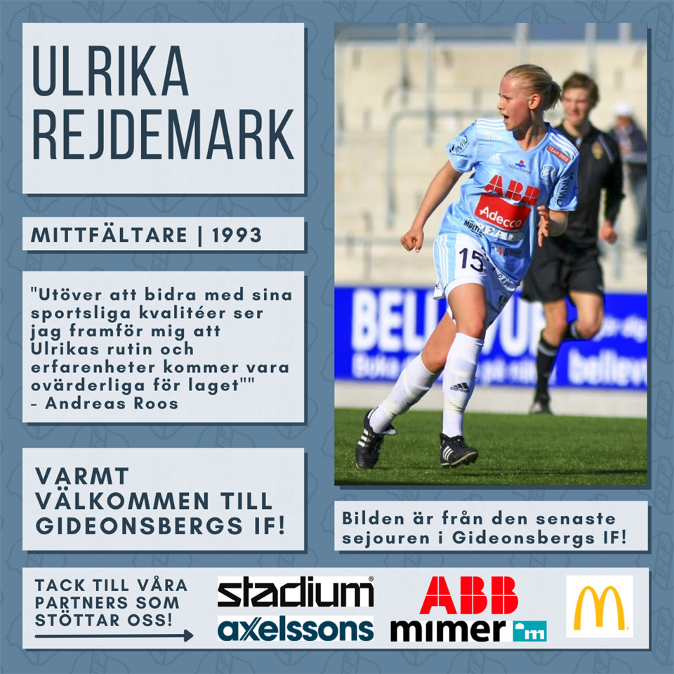 Nästa spelare att presenteras är ett hemvändande nyförvärv! Det är Ulrika Rejdemark som är tillbaka efter nästan tio år! Hur ser du tillbaka på dina tidigare år i GIF? - GIF är föreningen jag växte upp i, jag började på fotbollslekis '98 som femåring och har en massa roliga minnen från cuper o allt hela vägen upp till A-laget som jag sedan lämnade 2012. Hur har din spelarkarriär varit sedan dess? - Gick över till BK30 för att fortsätta spela i Norrettan men hann inte spela länge innan jag drog på mig skador. En fotoperation och två korsbandsoperationer senare, med mycket hjälp från klubben och Pentti, kunde jag ta mig tillbaka. Året vi tog oss upp i Elitettan är det året jag alltid kommer ta med mig. - Det är häftigt hur man som lag kan gå samman och kämpa för samma mål, vi hade verkligen bestämt oss och klarade det tillsammans. Det året är jag väldigt stolt över. Spelade därefter 2 år i Elitettan. Efter degraderingen hittade jag fotbollsglädjen i IFK Västerås med ett fantastiskt gäng där vi tog oss upp i div.1. Nu senast var det div.3 med VSK, så mestadels av tiden har jag tillbringat på div.1-nivå och sedan blandat det med högre och lägre divisioner. Hur skulle du beskriva dig själv som spelare? - Jag är en spelare som är lugn med bollen och som använder huvudet, både i speluppfattning och i boxen. Vad fick dig att återigen ansluta till GIF? - Omöjligt att säga nej till Erik haha. Det är en talangfull men ung trupp du ansluter till. Vad känner du att du kan bidra med på och vid sidan av planen? - Har nog en hel del rutin att plocka fram när så behövs men framförallt vill jag vara en stöttepelare och försöka ta ner pressen som kan uppstå. Påminna om att fotboll ska vara kul och förhoppningsvis bidra med att göra dem till ännu bättre fotbollsspelare. I ledarrumet är man glada över nyförvärvet. - Det gläder oss att få in en spelare med meriter från elitnivå. Utöver att bidra med sina sportsliga kvalitéer ser jag framför mig att Ulrikas rutin och erfarenheter kommer vara ovärderliga för laget, säger Andreas Roos Vi hälsar Ulrika varmt välkommen tillbaka till GIF och ser fram emot att följa henne och laget under 2022!