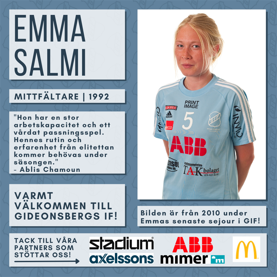 Idag presenterar vi återvändande nyförvärvet Emma Salmi! Vi har självklart ställt några frågor till henne: Hur ser du tillbaka på dina tidigare år i GIF? - Jag skolades under mina år i GIF. När jag började gick jag i högstadiet tror jag och chansar på 2005-2006. Vi var ett riktigt tajt gäng som trivdes med varandra på och utanför planen, vilket också gjorde oss till duktiga och talangfulla fotbollsspelare. Har man en stark grupp som strävar efter ett gemensamt mål brukar det ofta gå bra fotbollsmässigt också. När jag tog klivet upp i A-laget 2009 formades och utvecklades till den spelare som jag är än idag. 2012 lämnade jag GIF för spel med BK30. Hur har din spelarkarriär varit sedan dess? - Jag spelade med BK30 och var med och byggde upp laget till avancemang och spel i elitettan 2017. Det blev en säsong i elitettan för min del då jag fick mitt första barn 2018. 2019 anslöt jag till IFK och där var jag med när vi tog oss upp i div1. Jag hann spela klart hela säsongen trots att jag var gravid med andra barnet. Hur skulle du beskriva dig själv som spelare? - Vinnarskalle är så som jag brukar beskriva mig. Och så är jag självklart en lagspelare. Ingen kan göra något ensam. Vad fick dig att ansluta till GIF inför 2022? - Kort och gott. För att fotboll är min typ av träning. Sen för gemenskapen man får av att spela i ett lag. Det är en talangfull men ung trupp du ansluter till. Vad känner du själv att du kan bidra med? - Rutin och erfarenhet av att spela i div1 och elitettan samt den hårda träning som krävs. Jag hoppas att min "vinnarskalle-mentalitet” ska smitta av sig. Sen är jag en genomgod och glad tjej även fast det kanske inte alltid märks när jag är på fotbollsplanen. Det ska bli så kul att få bli en del av denna unga och talangfulla grupp av framtida elitspelare. Från ledarrumet kommenterar Ablis Chamoun nyförvärvet: "Emma är en fysiskt stark spelare som går in med 100% i varje duell. Hon har en stor arbetskapacitet och ett vårdat passningsspel. Hennes rutin och erfarenhet från elitettan kommer behövas under säsongen" Vi hälsar Emma varmt välkommen tillbaka till GIF och ser fram emot att följa henne och laget under 2022!