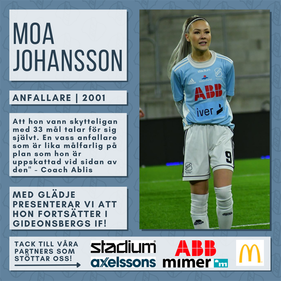 Moa Johansson stod för en otroligt imponerande säsong där hon med sina 33 mål vann skytteligan i serien. Den 20 år gamla anfallaren blev med det den fjärde bästa målskytten i alla serier och det är med glädje vi presenterar att hon fortsätter i ljusblått! Ni ska nu få lära känna Moa lite bättre: Hur ser din fotbollsbakgrund ut? - Jag startade i Rytterne IS där jag spelade med killarna ett bra tag tills det startades upp ett tjejlag, då bytte jag dit. Sen så lade Rytterne ner och jag anslöt till GIF för ungefär 5 år sedan. Hur är din känsla och dina förhoppningar inför säsongen 2022? - Vi är ett duktig lag och jag vet att vi kommer kunna ta oss långt i div 1 om vi har viljan. Du gjorde hela 33 mål i div.2 och var fjärde bästa målskytt i landet. Vad tror du krävs för att hålla den fina målformen även i div 1? - Det som krävs är att jag tränar lika mycket som jag gjorde i slutet av säsong två, jag behöver även komma i form med sömn, kost och allt som hänger ihop med det. Vad känner du är det bästa med GIF och laget? Vad driver dig att fortsätta hos oss? - Det som är det bästa är ju alla underbara tjejer och den energin som man får av laget, det är mycket positivitet och man kan verkligen vara sig själv vilket är jätteskönt. Vi har som alltid hört oss för om vad som sägs om spelaren i ledarrummet. - Moa är en spelare som varit oerhört viktig för laget. Att hon vann skytteligan med 33 mål talar för sig självt. En vass anfallare som är lika målfarlig på plan som hon är uppskattad vid sidan av den, säger Ablis Chamoun Vi tackar Moa för hennes insatser under 2021 och är oerhört glada över att ha henne kvar hos oss. Vi önskar henne och laget all lycka under 2022!
