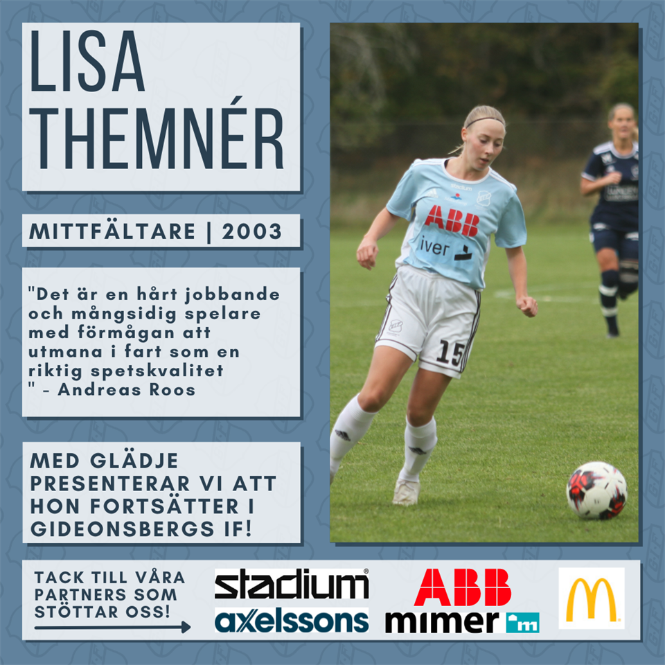 18 år gamla Lisa Themnér är nästa spelare vi med glädje kan berätta kommer fortsätta hos oss. Lisa kan spela på många positioner och var lagets tredje bäste målskytt under seriespelet 2021 med sina 10 fullträffar. Ni ska nu få lära känna henne bättre.. Hur ser din fotbollsbakgrund ut Lisa? - Jag började spela fotboll i Tillberga IK och anslöt till GIF 2014 när jag var 11 år. Hur ser du på säsongen du haft under 2021? - Jag tycker att förra säsongen gick väldigt bra för mig, då jag gjorde fler mål än vad jag gjorde året innan och laget spelade bra fotboll. Jag fick även spela på olika positioner vilket gjorde att jag kunde utvecklas på flera olika sätt. Vad är det som driver dig när det kommer till fotbollen? Och varför är just GIF rätt miljö att fortsätta i? - Det som har drivit mig inom fotbollen är att jag har kunnat utvecklats varje år och det tycker jag att GIF har hjälpt mig med. Det är även lagkompisarna som har drivit mig då det alltid har varit roligt på träningar och i omklädningsrummet. Hur är känslan och förväntningarna inför säsongen 2022? - Min känsla är att det kommer vara tufft motstånd vilket ska bli roligt eftersom det är nya utmaningar för laget. Men jag tror att vi kommer kunna lösa det på ett bra sätt genom att vi tränar mycket. Under 2021 var du en del av det lag som så övertygande vann div 2. Vad tror du krävs för att du själv och laget ska fortsätta utvecklas och prestera lika bra även i div 1? - Det som kommer att krävas är bra träningar och att vi alla i laget ger allt för att träningarna ska vara så utmanande som möjligt. Jag tror att så länge vi spelar som ett lag och gör allt vi kan så kommer vi kunna prestera på matcherna. Från ledarrummet sägs följande om Lisa: - Lisa har en god förmåga att anpassa sig och sitt spel beroende på sin position och är en riktig lagspelare. Det är en hårt jobbande och mångsidig spelare med förmågan att utmana i fart som en riktig spetskvalitet, säger Andreas Roos. Vi tackar Lisa för hennes insatser under 2021 och är oerhört glada över att ha henne kvar hos oss. Vi önskar henne och laget all lycka under 2022! Division 2 Dam 22 dec 2021 0kommentarer