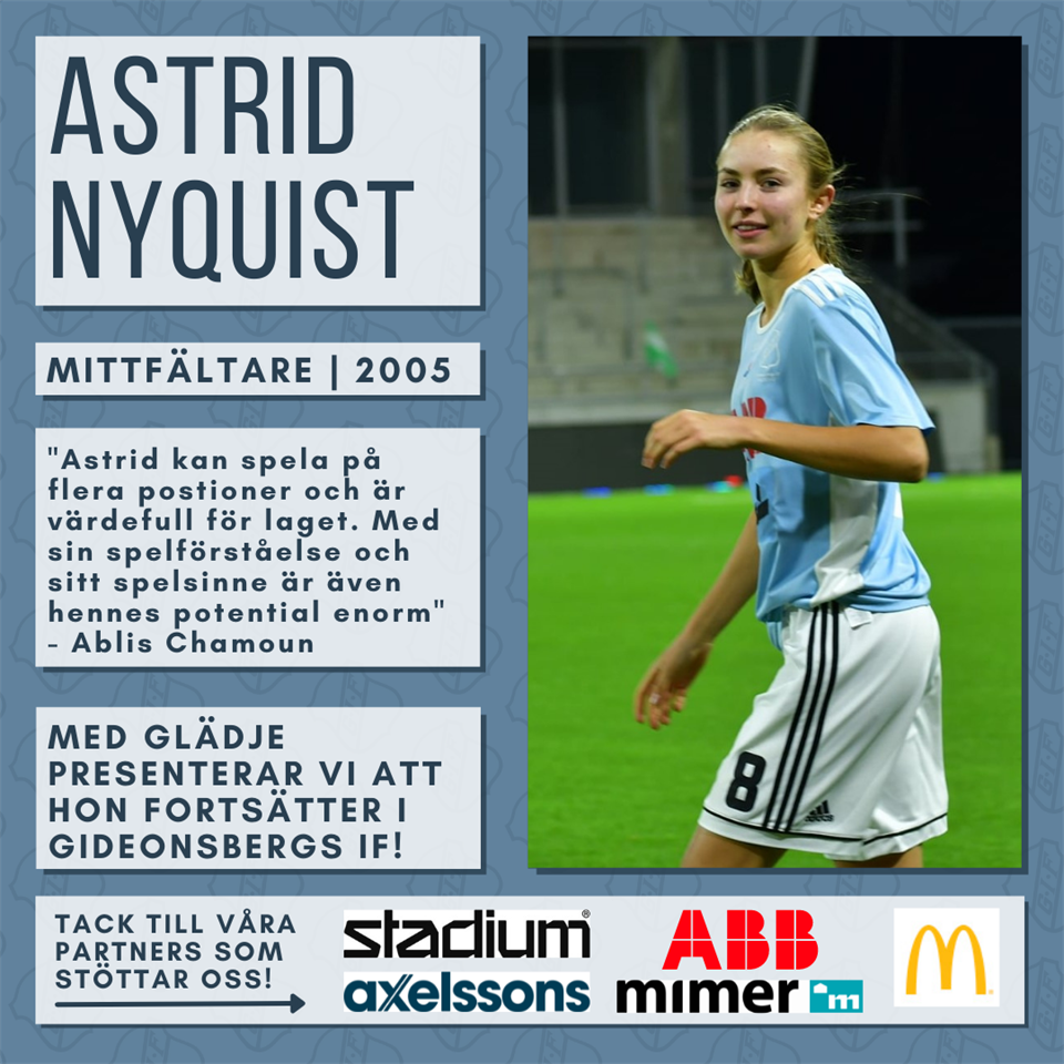 Astrid Nyquist som är näst på tur att presenteras har denna säsong imponerat med sitt fartfyllda spel i såväl GIF som i F16 landslaget. Astrid egna ord om sig, sin säsong och framtiden kan ni läsa här nedan! Hur ser din fotbollsbakgrund ut? - Jag började i IFK Västerås fotbollslekis när jag var fem år gammal. Sedan spelade jag i deras 04/05 lag fram till för tre år sedan när vi slog ihop med Gideonsberg eftersom båda lagen hade ont om spelare. Hur ser du på säsongen du haft under 2021? - Säsongen har varit blandad. Den började lite trassligt med att vi inte fick träna inomhus och spela träningsmatcher men kom sedan igång bra. Det var kul att få spela A-lagsfotboll och i F17 SM. Vad är det som driver dig när det kommer till fotbollen? Och varför är just GIF rätt miljö att fortsätta i? - Jag drivs av att vilja bli så bra som möjligt och då tror jag att GIF kan erbjuda många bra träningar och matcher med andra duktiga och ambitiösa spelare. Hur är känslan och förväntningarna inför säsongen 2022? - Känslan är bra och jag hoppas kunna ta några steg till i min fotbollsutveckling. Under 2021 var du en del av det lag som så övertygande vann div 2. Vad tror du krävs för att du själv och laget ska fortsätta utvecklas och prestera lika bra även i div 1? - Jag tror det krävs att alla kämpar hårt varenda träning och match för att fortsätta utvecklas både som lag och individuellt. I ledarrummet har man bra koll på Astrid som kommit från dem egna leden. - Astrid kan spela på flera postioner och är värdefull för laget. Med sin spelförståelse och sitt spelsinne är även hennes potential enorm, säger Ablis Chamoun Vi tackar Astrid för hennes insatser under 2021 och är oerhört glada över att ha henne kvar hos oss. Vi önskar henne och laget all lycka under 2022! #Svenskfotboll #Damfotboll #GideonsbergsIF Division 2 Dam 24 dec 2021 0kommentarer