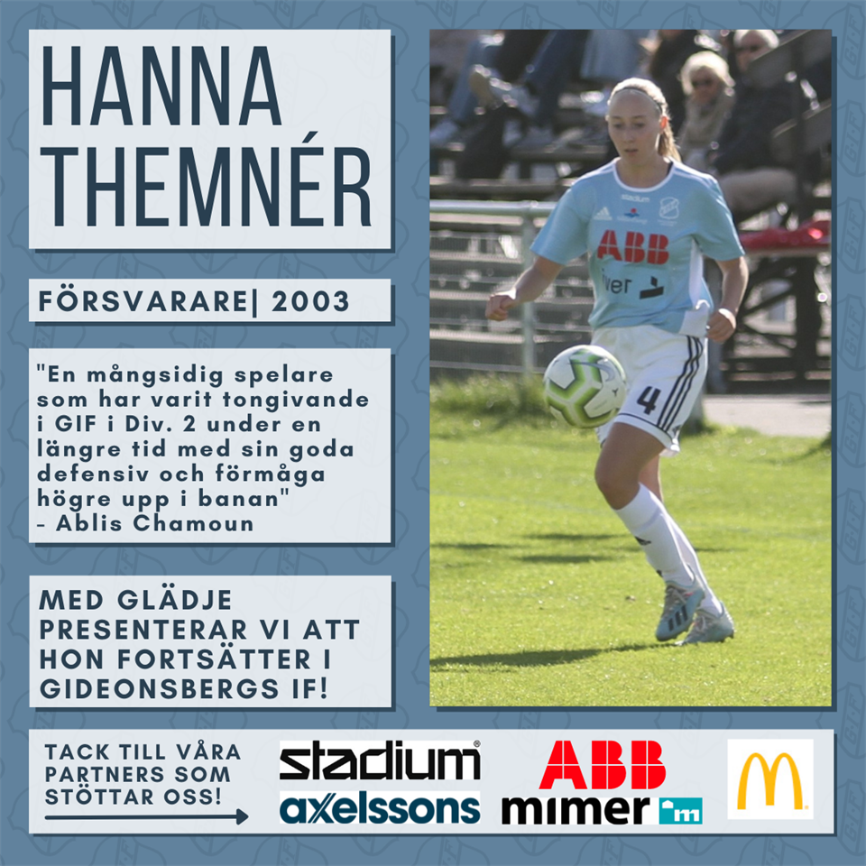 Hanna Themnér har varit i föreningen länge och det är glädjande för oss att den 18 år gamla spelaren fortsätter i ljusblått. Hon är en mångsidig spelare som kan spela på flera positioner och vi har hört vad hon har att säga om 2021, 2022 och sig själv. Hur ser din fotbollsbakgrund ut? - Innan jag började spela fotboll i GIF spelade jag i Tillberga IK. Jag anslöt till Gif när jag var runt 10-11 år. Hur ser du på säsongen du haft under 2021? - I början av säsongen blev jag skadad och kunde inte spela fotboll så mycket under säsongen. Men när jag kunde spela tycker jag att det gick rätt bra. Vad är det som driver dig när det kommer till fotbollen? Och varför är just GIF rätt miljö att fortsätta i? - Det som driver mig är att bli bättre och att personerna runt om kring mig också vill det. Jag tycker att GIF är den rätta klubben för mig att fortsätta utvecklas i. Hur är känslan och förväntningarna inför säsongen 2022? - Det ska bli roligt men samtidigt tuff eftersom man möter ett bättre motstånd. Under 2021 var du en del av det lag som så övertygande vann div 2. Vad tror du krävs för att du själv och laget ska fortsätta utvecklas och prestera lika bra även i div 1? - Jag tror att vi måste fortsätta att driva varandra under träningarna för göra varandra bättre och fortsätta att utvecklas. Vi har som alltid hört oss för om vad som sägs om spelaren i ledarrummet. - En mångsidig spelare som har varit tongivande i GIF i Div. 2 under en längre tid med sin goda defensiv och förmåga högre upp i banan. Hon missade tyvärr en hel del av denna säsong men kan nu blicka framåt mot ytterligare kliv i nivå och sin utveckling. Det är en lagspelare som alltid jobbar hårt för sig själv och laget på ett föredömligt sätt, säger Ablis Chamoun. Vi tackar Hanna för hennes insatser under 2021 och är oerhört glada över att ha henne kvar hos oss. Vi önskar henne och laget all lycka under 2022! Division 2 Dam 25 dec 2021 0kommentarer