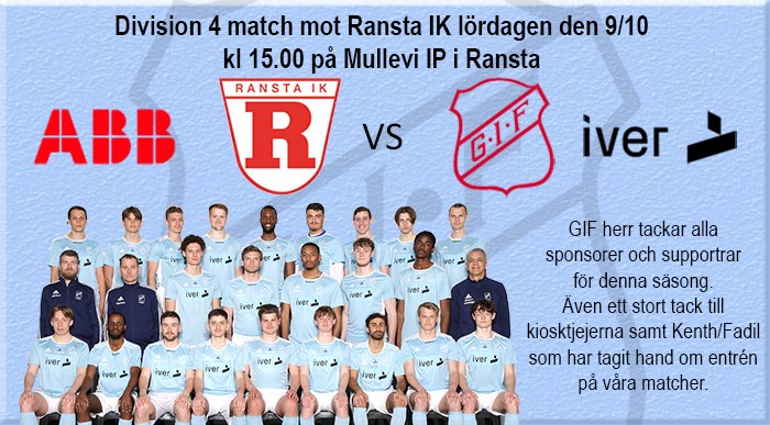 Säsongens sista och viktigaste match. Kom till Mullevi IP i Ransta och heja fram GIFarna till en skön seger. Matchstart kl 15.00 Hoppas vi ses där. //GIF herr A-lag Herr 8 okt 2021 0kommentarer